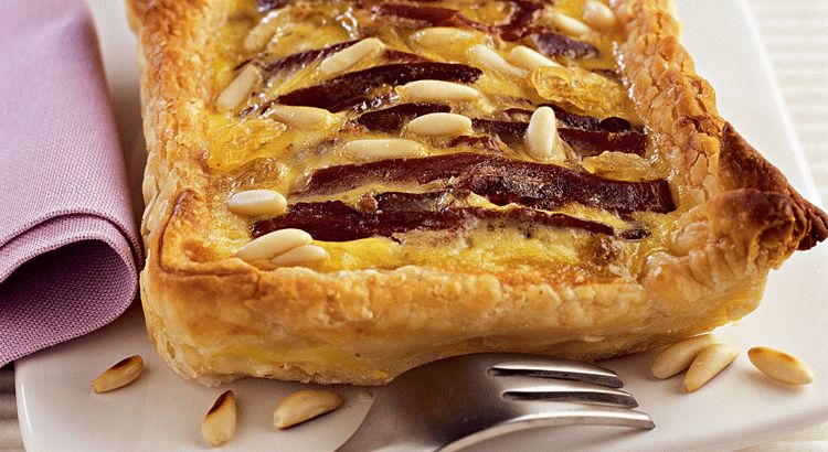 - Étalez la pâte feuilletée dans un moule à tarte, puis répartissez uniformément le mélange de pignons, de magret et de raisins.
