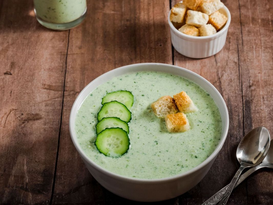 Pour 4 personnes. Couper 2 concombres, ajouter un bouquet de menthe, 200 g de fromage blanc, assaisonner et mixer. Réfrigérer avant de servir.