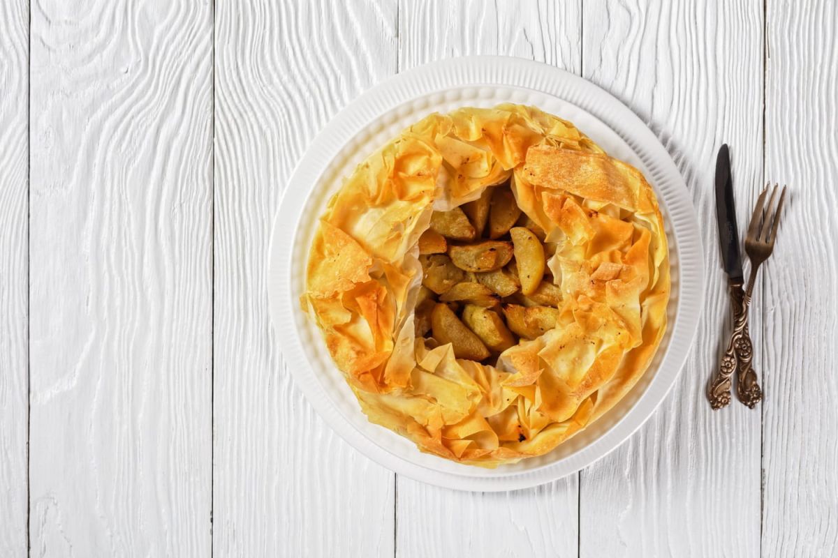 - Tranchez les boudins et étalez une feuille de pâte filo sur un plan de travail. Badigeonnez-la de beurre fondu et placez-la dans une poêle. Répétez avec une seconde feuille, puis garnissez-les avec les pommes poêlées. Disposez ensuite des tranches de boudin.