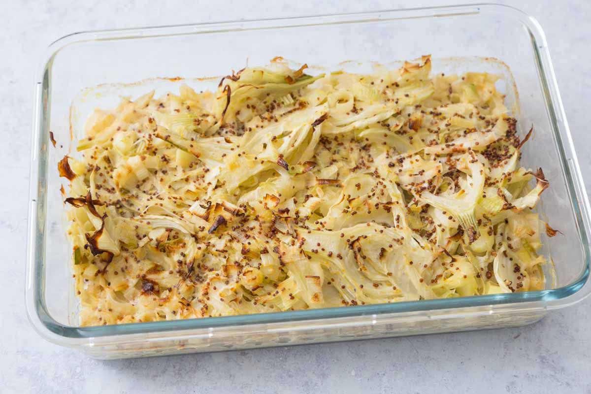 - Dans une poêle, faites revenir les oignons, l'ail pressé, le poireau et le fenouil pendant environ 10 minutes. Assaisonnez puis versez le tout dans un plat allant au four. Recouvrez avec la préparation aux noix de cajou.