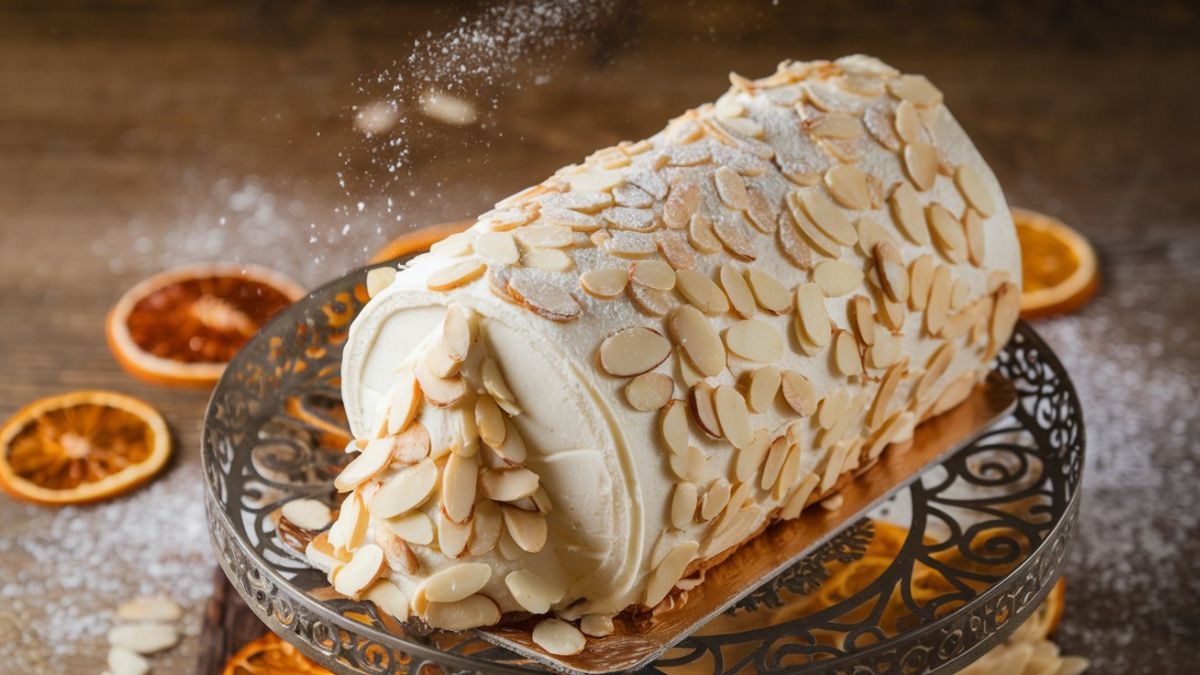 - Ornez et servez : Fouettez la ganache restante et recouvrez la bûche en ajoutant des amandes caramélisées pour la finition.