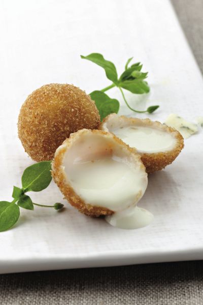Cromesquis : Trempez la gélatine dans de l'eau froide. Dans une casserole, faites chauffer la fourme d'Ambert avec la crème, puis incorporez la gélatine égouttée. Hors du feu, ajoutez la béchamel et passez à travers une passoire fine. Remplissez de petites demi-sphères avec ce mélange et laissez refroidir plusieurs heures au réfrigérateur.