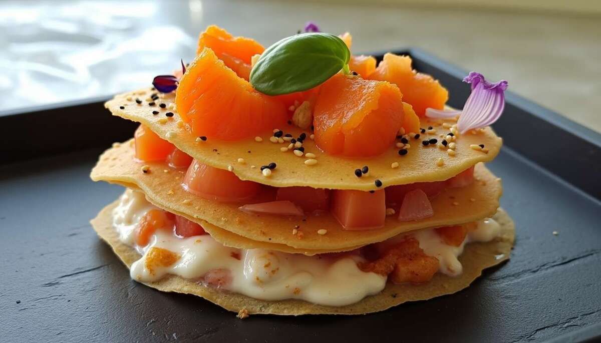 Pour apporter une touche colorée et savoureuse, n’hésitez pas à ajouter quelques feuilles de roquette fraîche entre les couches de millefeuille.