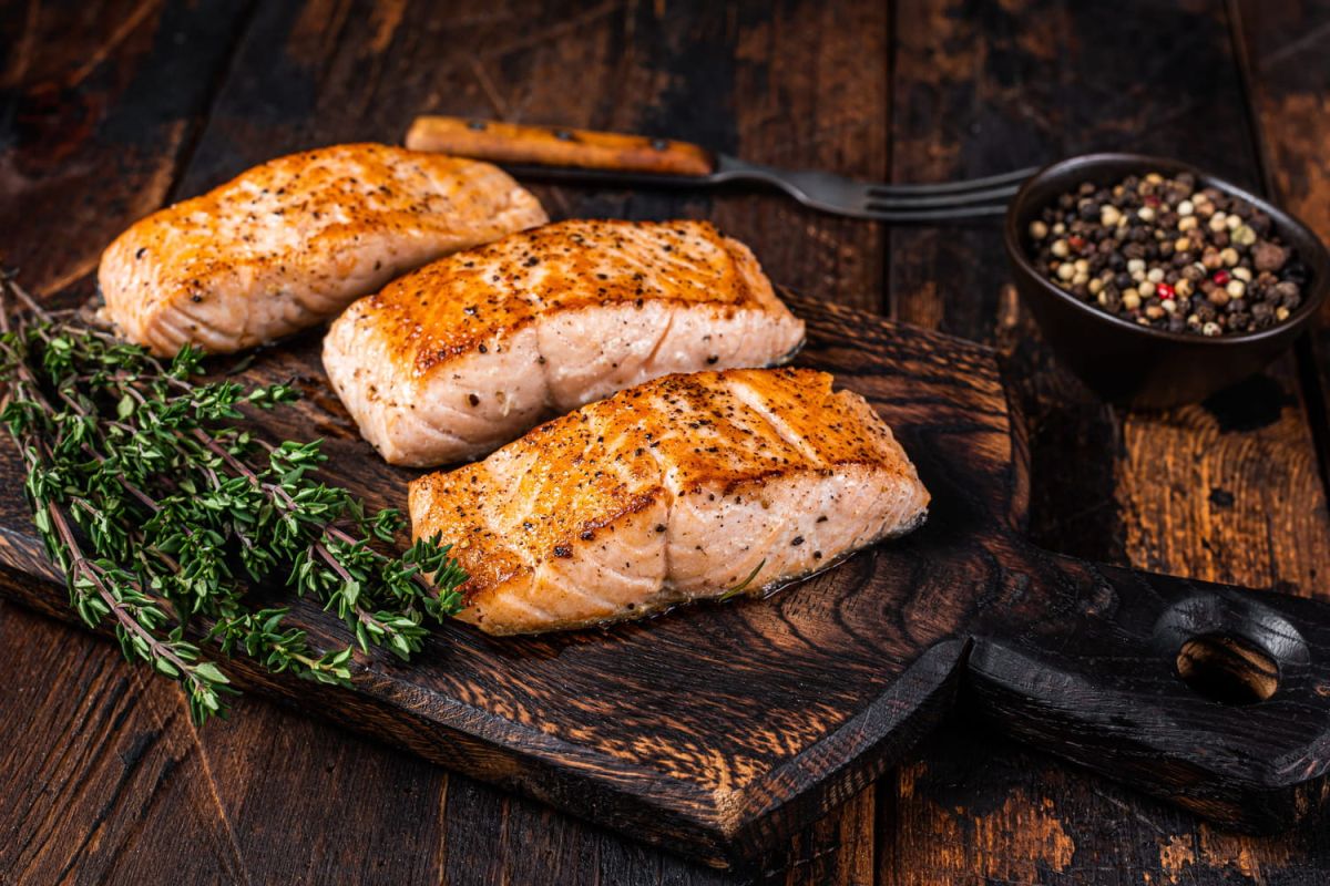- Passez à la cuisson du saumon. Faites chauffer une poêle avec un filet d'huile d'olive et salez les pavés de saumon avant de les déposer dans la poêle chaude.