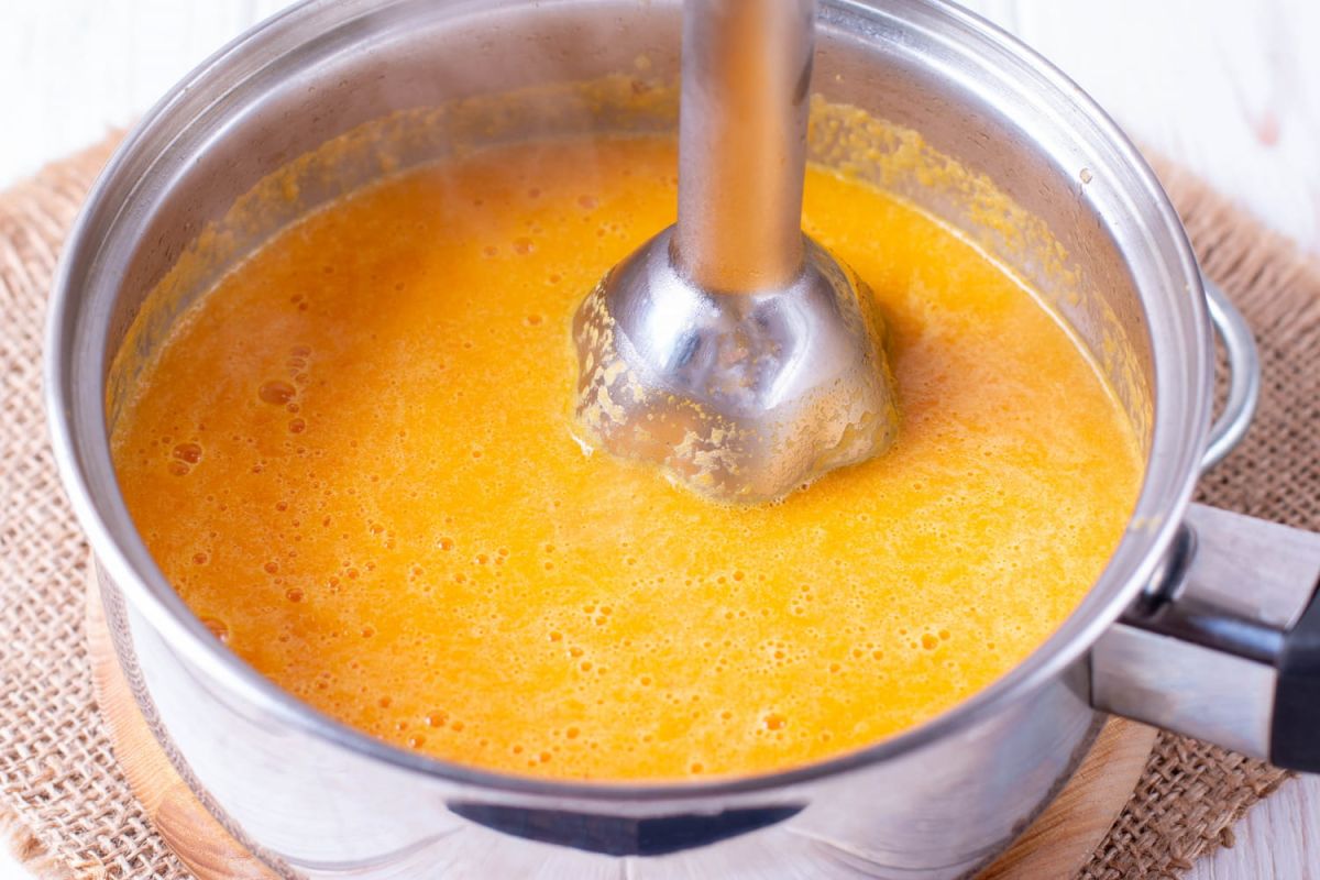 - Lorsque les patates douces sont tendres, passez au mixeur. L'astuce ici : retirez quelques louches de bouillon avant de mixer. Cela vous permettra d'ajuster la texture par la suite, obtenant une consistance parfaite, selon votre goût. Écoutez les conseils du chef : "Comme ça, on est sûr de toujours réussir".