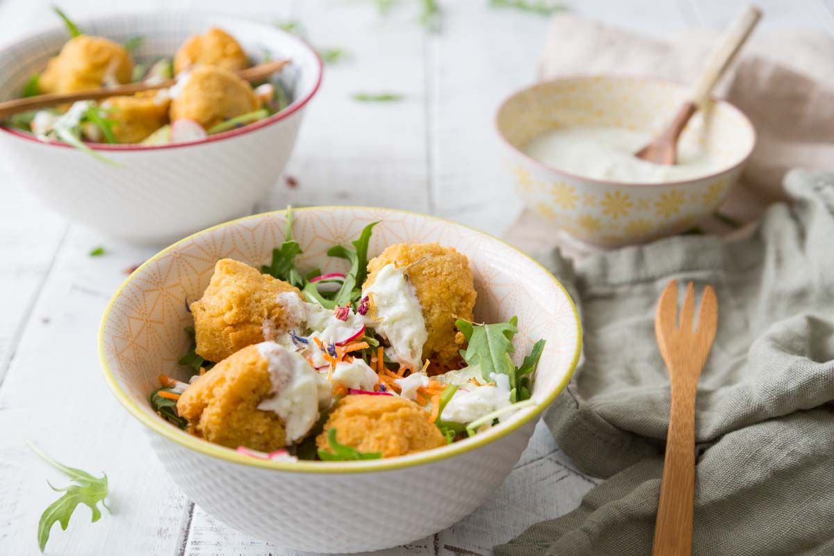 - Salade : Râpez les carottes, préparez le concombre en demi-rondelles après avoir retiré les graines, émincez les radis et coupez la feta en cubes. Disposez la roquette, les légumes et les falafels dans les assiettes et nappez de tsatsiki.